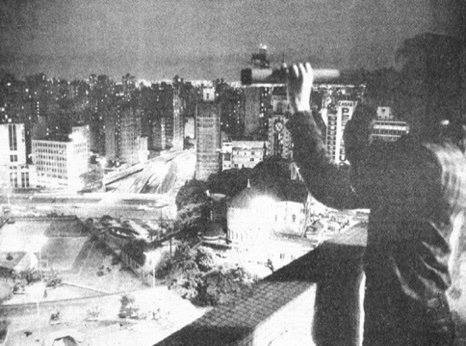 Inside of the gallery at the perching balcony, 2nd floor, a white medical examiner table. On it a telescope viewing the photo construct through the glass directly at the photomontage of the G7 world leader gathering lunch at the Art Gallery of Ontario.