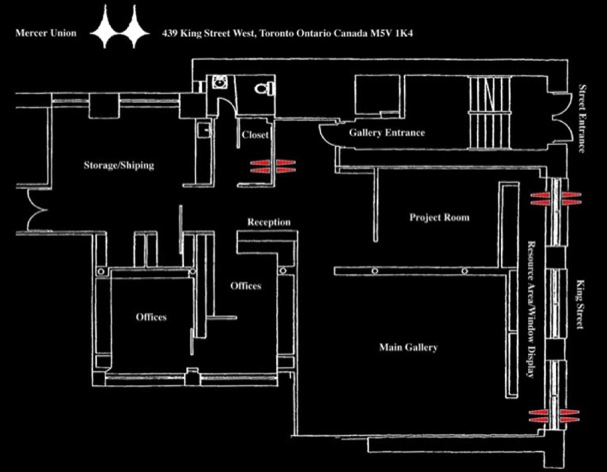 2 binoculars placed facing each other on both sides of the wall. 1 binocular in the gallery’s closet wall looking to the main entrance of the gallery and the other binocular placed on the entrance wall looking to the inside of the closet.